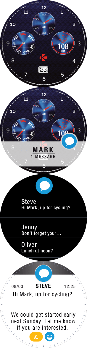 Lorsque la montre reçoit une notification, un bandeau apparaît, vous pouvez le faire disparaître soit en appuyant sur un bouton de la montre soit en glissant son doigt sur le bandeau.