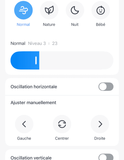 - Mode naturel : Ce mode permet de simuler des variations de débit d’air, créant ainsi une sensation plus dynamique et moins mécanique.