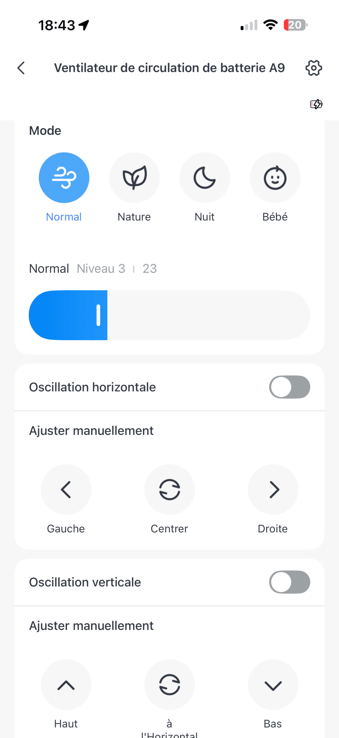 Chaque mode peut être réglé sur 9 niveaux de vitesse, offrant ainsi une grande flexibilité pour ajuster le débit d’air à vos préférences. L’application SwitchBot permet également d’ajuster la vitesse de manière encore plus précise, jusqu’à 100 niveaux. Un réglage particulièrement intéressant pour personnaliser le confort de manière fine.
