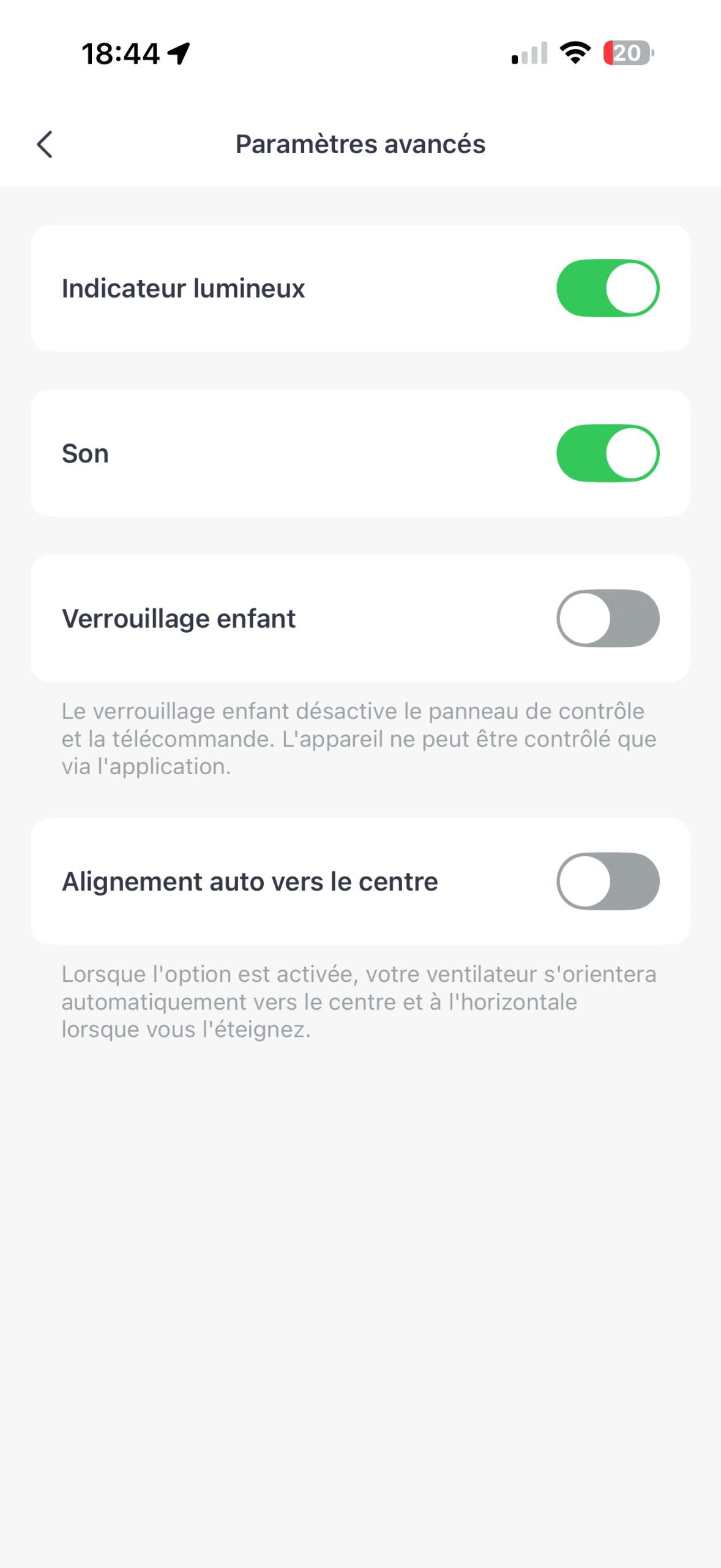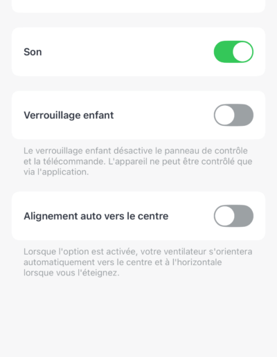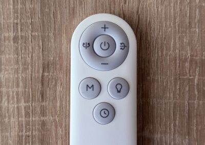 La télécommande permet de contrôler la plupart des fonctionnalités du ventilateur, telles que l’allumage et l’extinction, le réglage de la vitesse de ventilation et l’activation des oscillations. Toutefois, elle présente quelques limites : vous ne pouvez pas ajuster précisément l’angle de pivotement ou la direction du flux d’air.