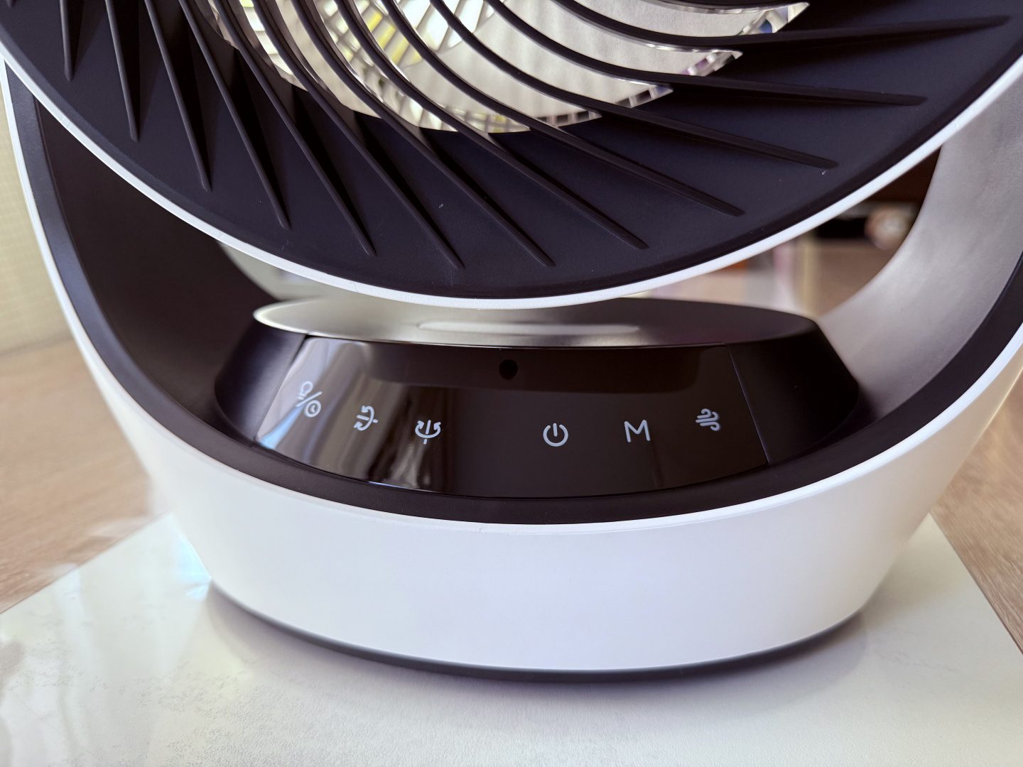 Le panneau de commande tactile situé sur le bas de l’appareil facilite l’interaction avec le ventilateur. Il affiche clairement les informations essentielles, comme le niveau de la batterie et le débit d’air en cours, ce qui permet de suivre en un coup d’œil l’état de l’appareil.