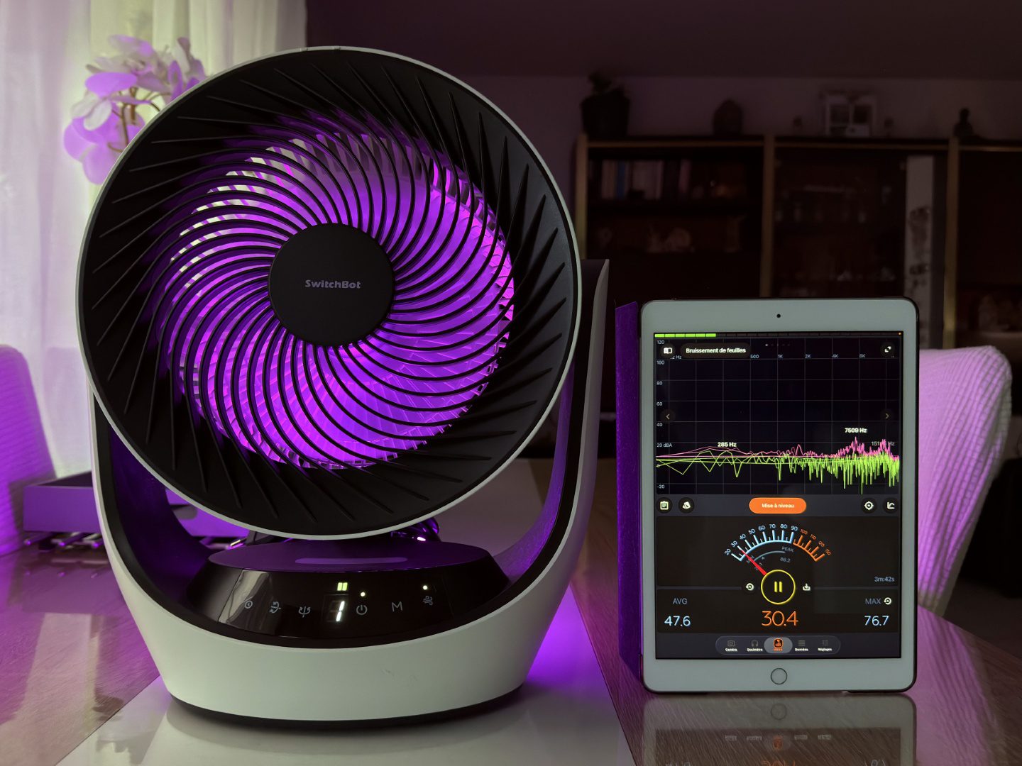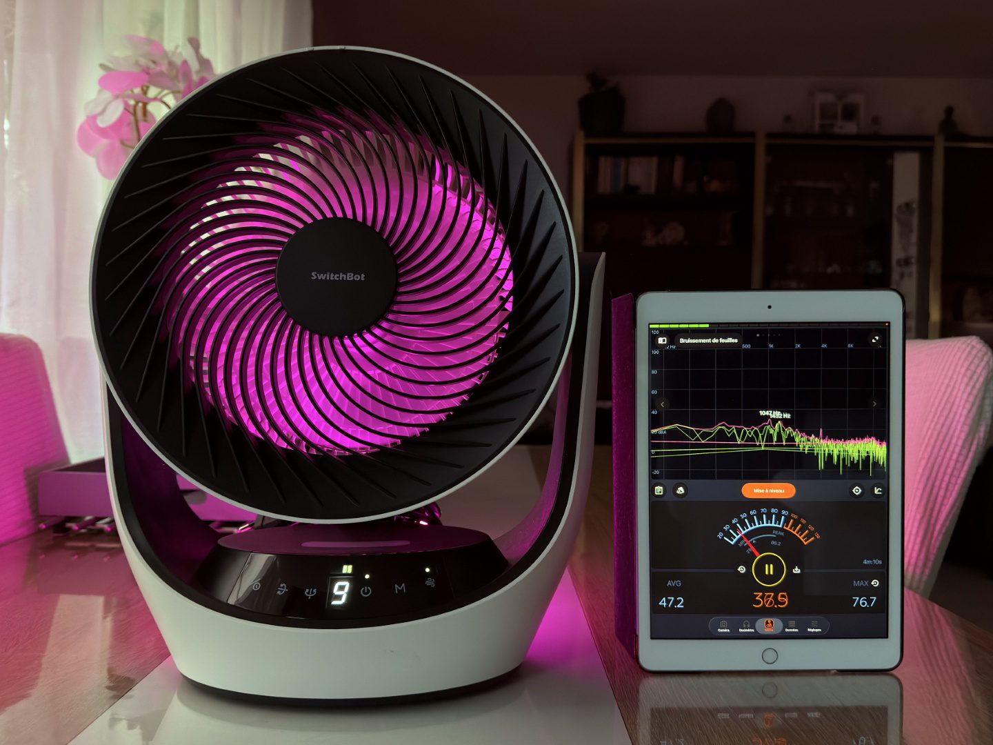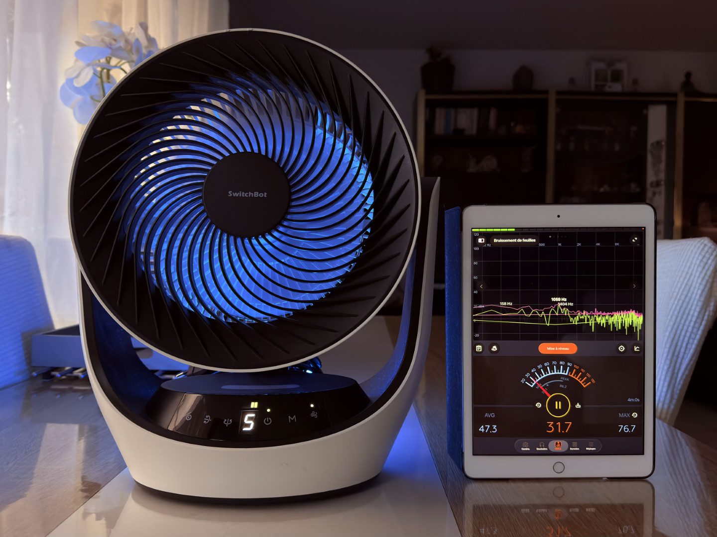 Le ventilateur SwitchBot offre un débit d’air exceptionnel, capable de souffler jusqu’à 14 mètres. Ce ventilateur est conçu pour diffuser l’air sur une large zone tout en maintenant un niveau sonore faible. À faible vitesse, le bruit est quasi inaudible, se limitant à environ 30 dB. Même à une vitesse élevée, le ventilateur reste silencieux, avec un bruit qui ne dépasse pas les 37 dB, ce qui est très discret comparé à de nombreux autres ventilateurs d’air sur le marché.