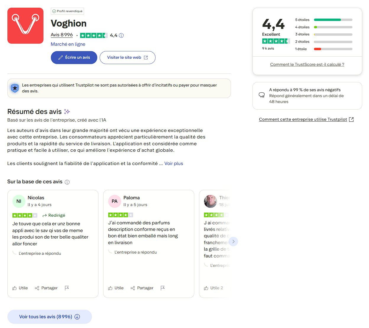 L’écart est spectaculaire. Une note de 4,4/5 positionne Voghion dans la catégorie des entreprises considérées comme fiables, bien loin des notes désastreuses de ses rivaux. Cela conforte l’idée que le modèle (logistique centralisée et contrôle des vendeurs) est, en effet, plus efficace.