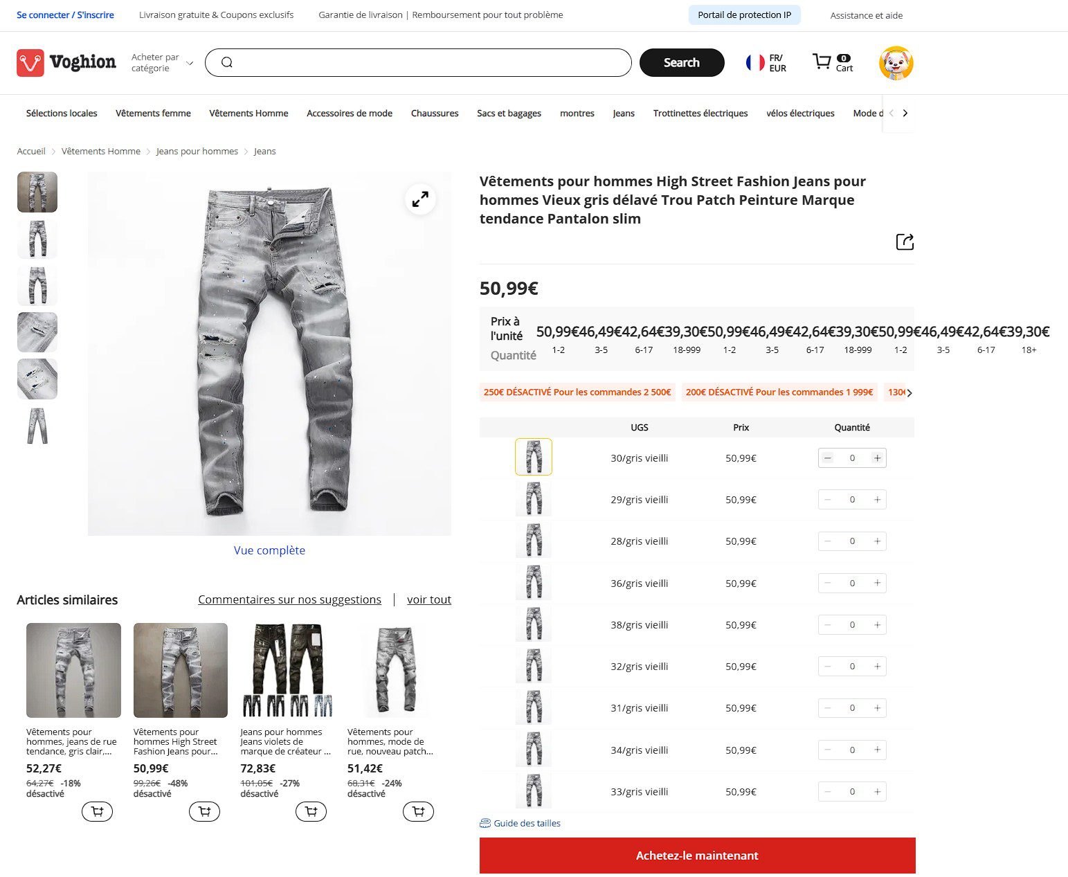 J’ai noté que le nombre de résultats est volontairement limité. Plutôt que d’être submergé par cinquante fiches produits identiques de cinquante vendeurs différents, Voghion présente souvent une seule fiche produit complète regroupant toutes les variations (tailles, couleurs, options).