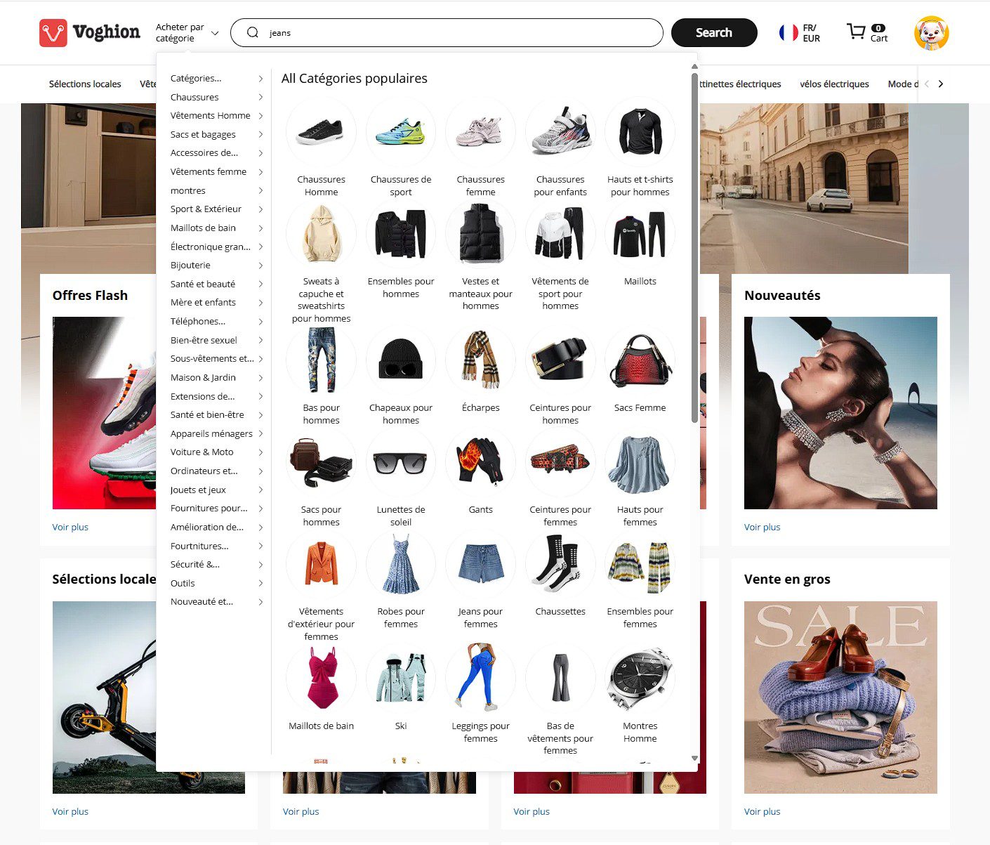 - Le méga-menu de catégories : Classique, il permet de se diriger vers des univers comme « Vêtements Homme, » « Maison & Jardin, » ou « Électronique. »